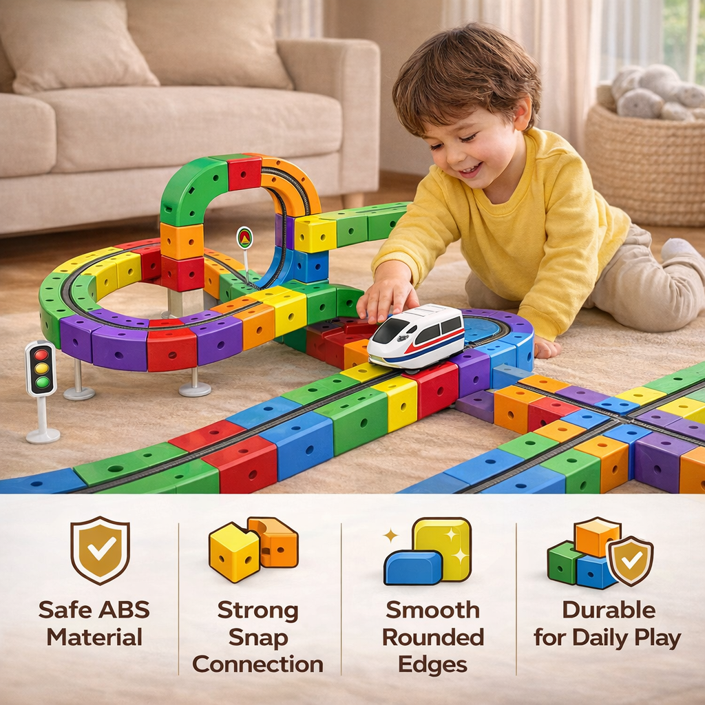 Instead of one fixed track, kids create limitless rail designs that keep the train moving, looping, and flowing nonstop — sparking curiosity, imagination, and problem-solving every time they rebuild.